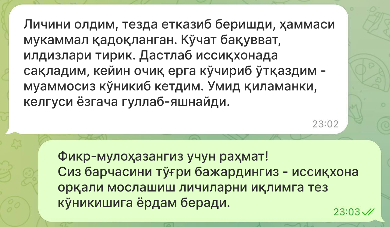 Кўчат кўкармаса, уни бепул алмаштирамиз.