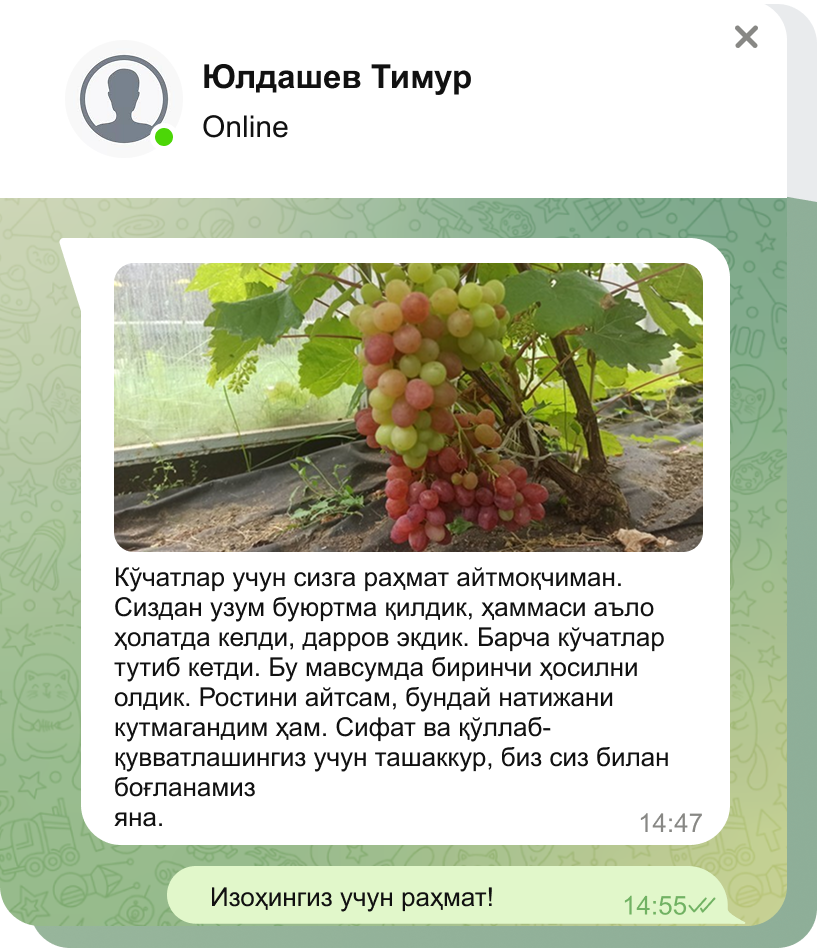 Тўғри экиш ва парваришлаш билан узум сизни мўл ҳосил билан хурсанд қилади.